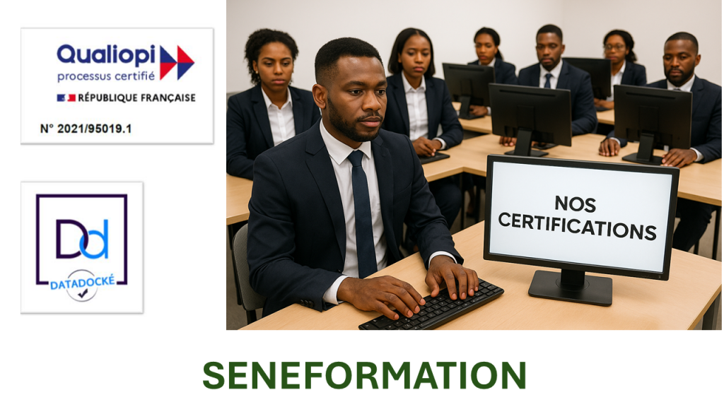 Ces certifications ont été délivrées à Seneformation suite à l’audit de plusieurs critères de qualité, notamment, le niveau d’études et la compétence de nos formateurs, la qualité de nos supports de formation, l’accompagnement des stagaires pendant et après leur formation, le processus d’inscription et de validation des inscriptions.